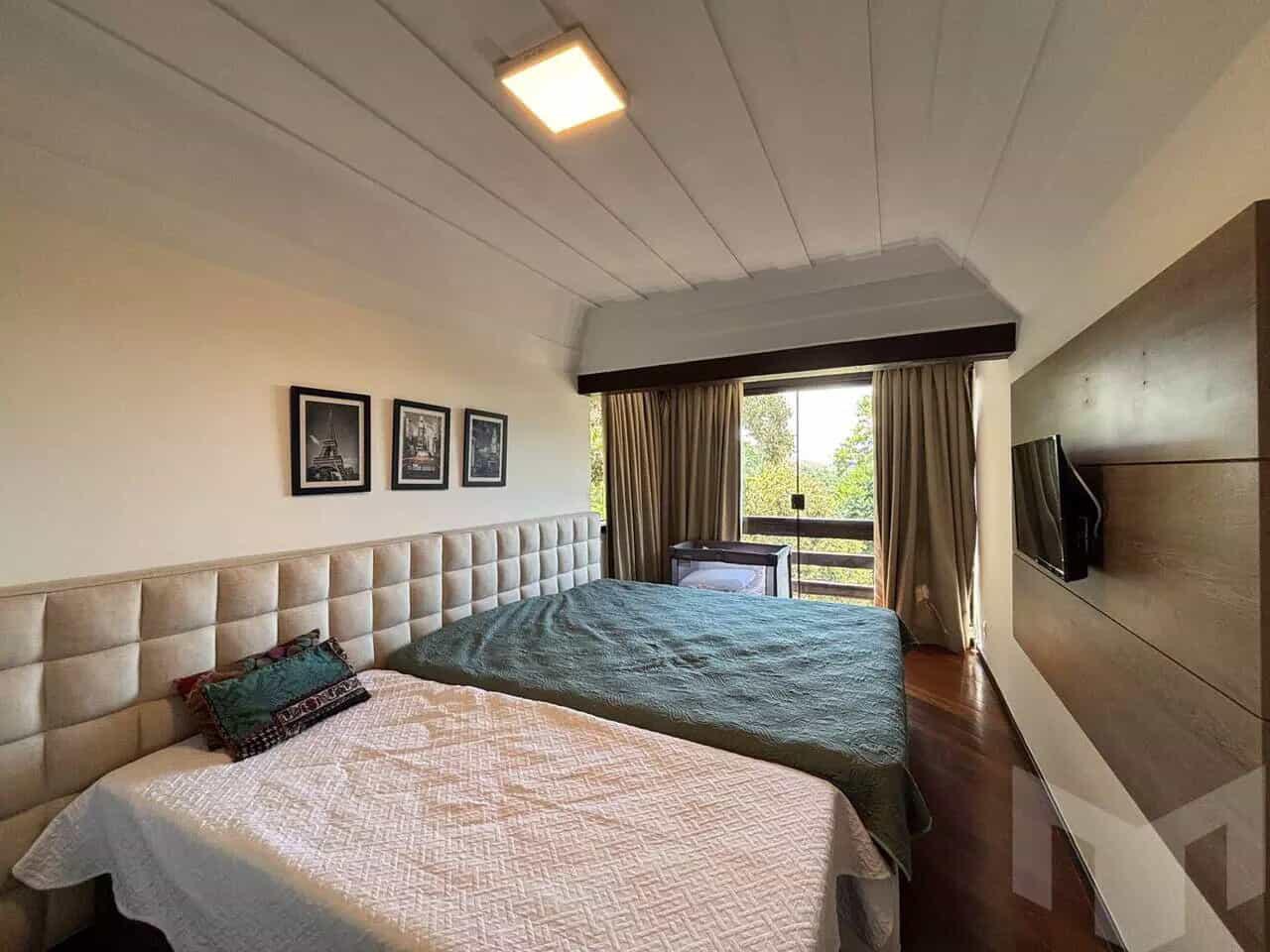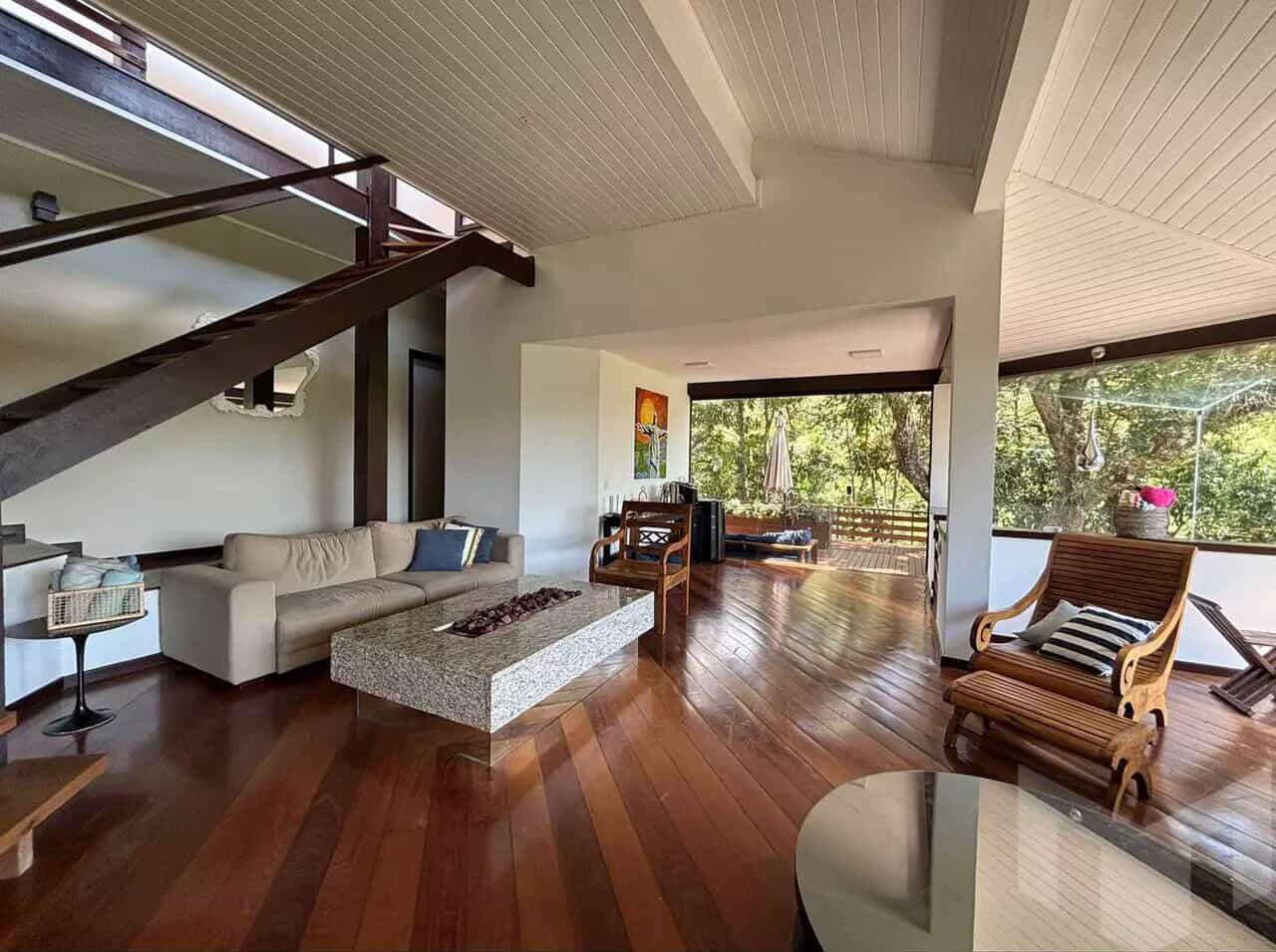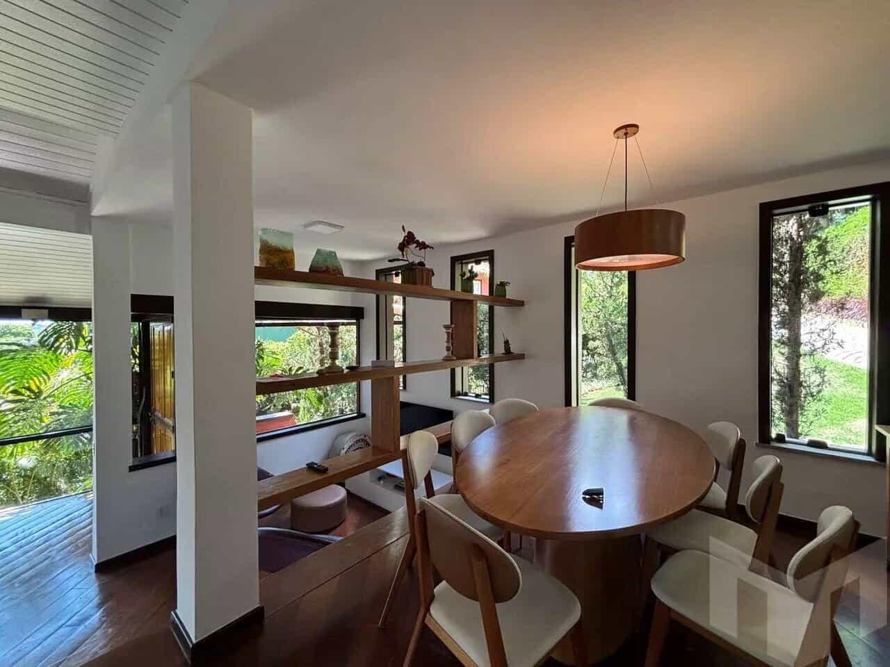 Sala de estar e jantar com lareira a gás cozinha,4 suítes + 1 de empregada, tolalizando 5 suítes. Deck externo em madeira, churrasqueira, adega subterrânea na pedra.