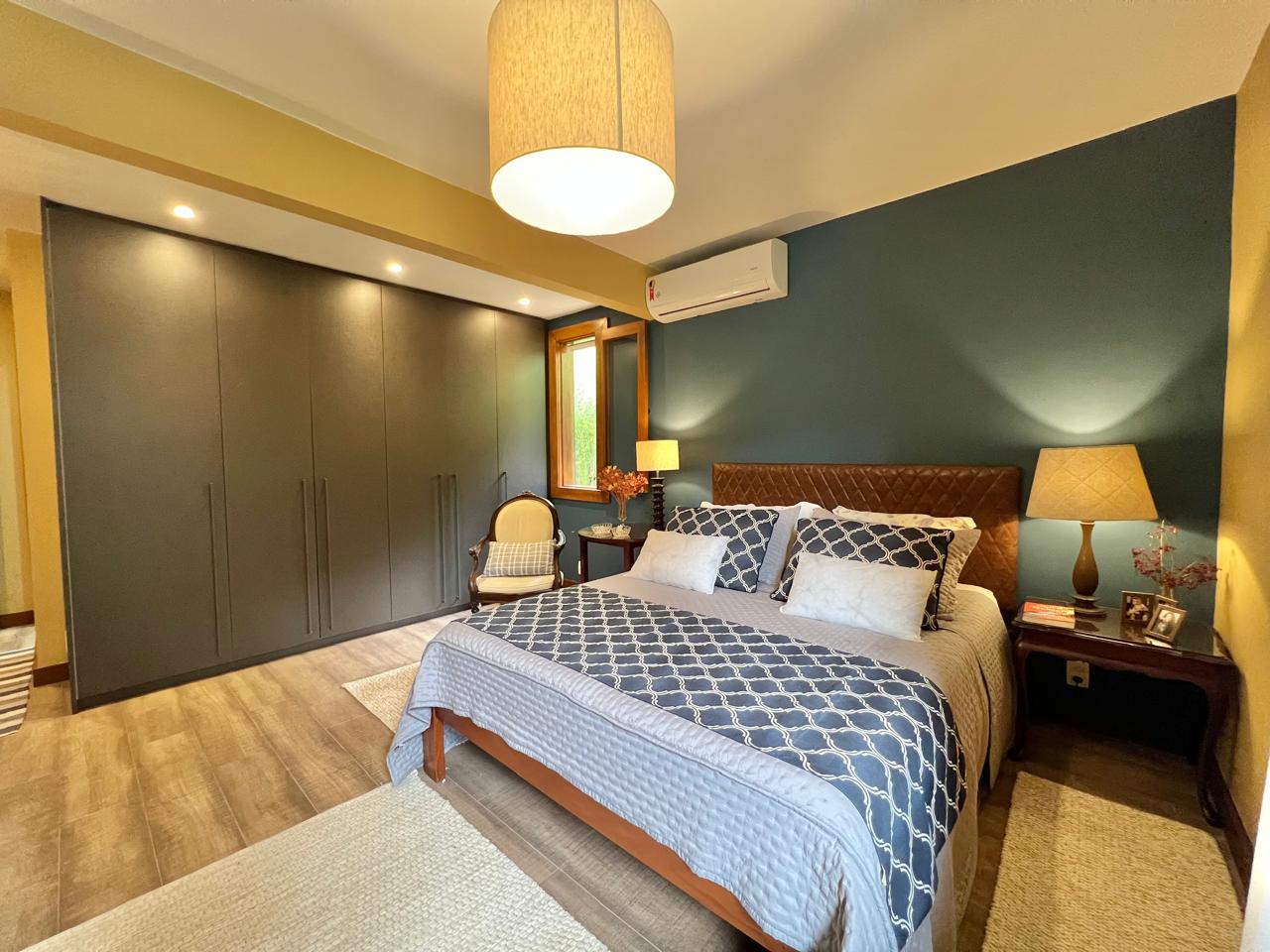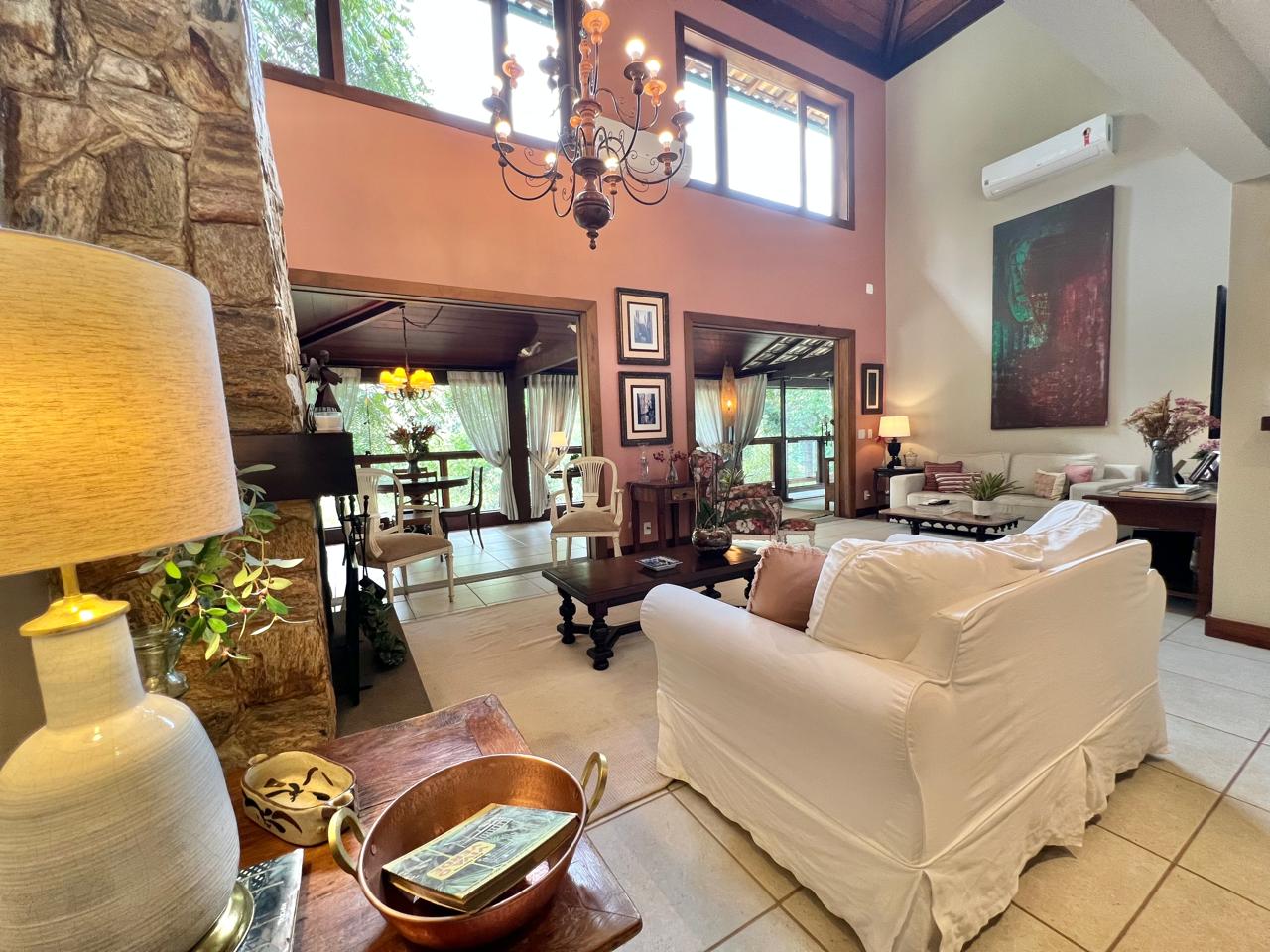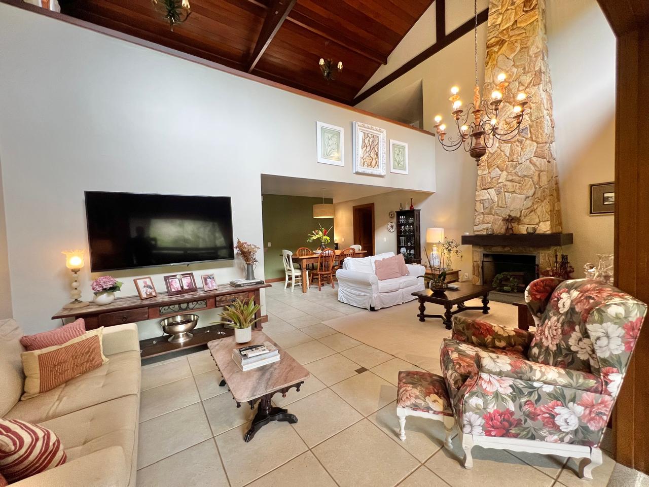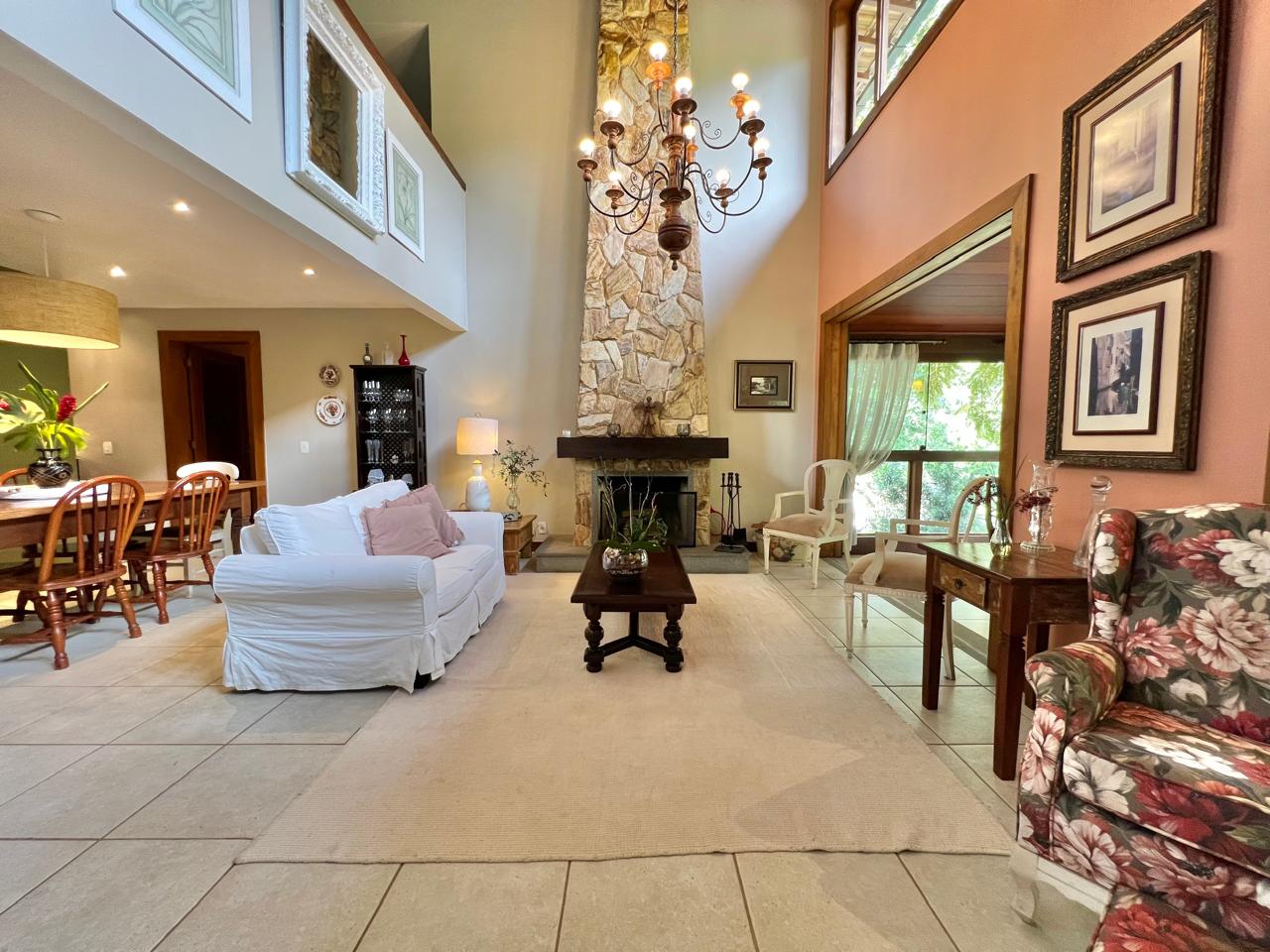 Ela conta com ótimo terreno, gramado e arborizado, que margeia o lago do condomínio, conta também com ótima estrutura de lazer: campo de futebol, salão de jogos, piscina, sauna, hidro e churrasqueira. A casa , com excelentes cômodos, é bem espaçosa composta por varandas, salas de estar, jantar e tv, lareira, lavabo, 4 ótimas suítes, cozinha com armários e área de serviço. Ótima localização e fácil acesso.