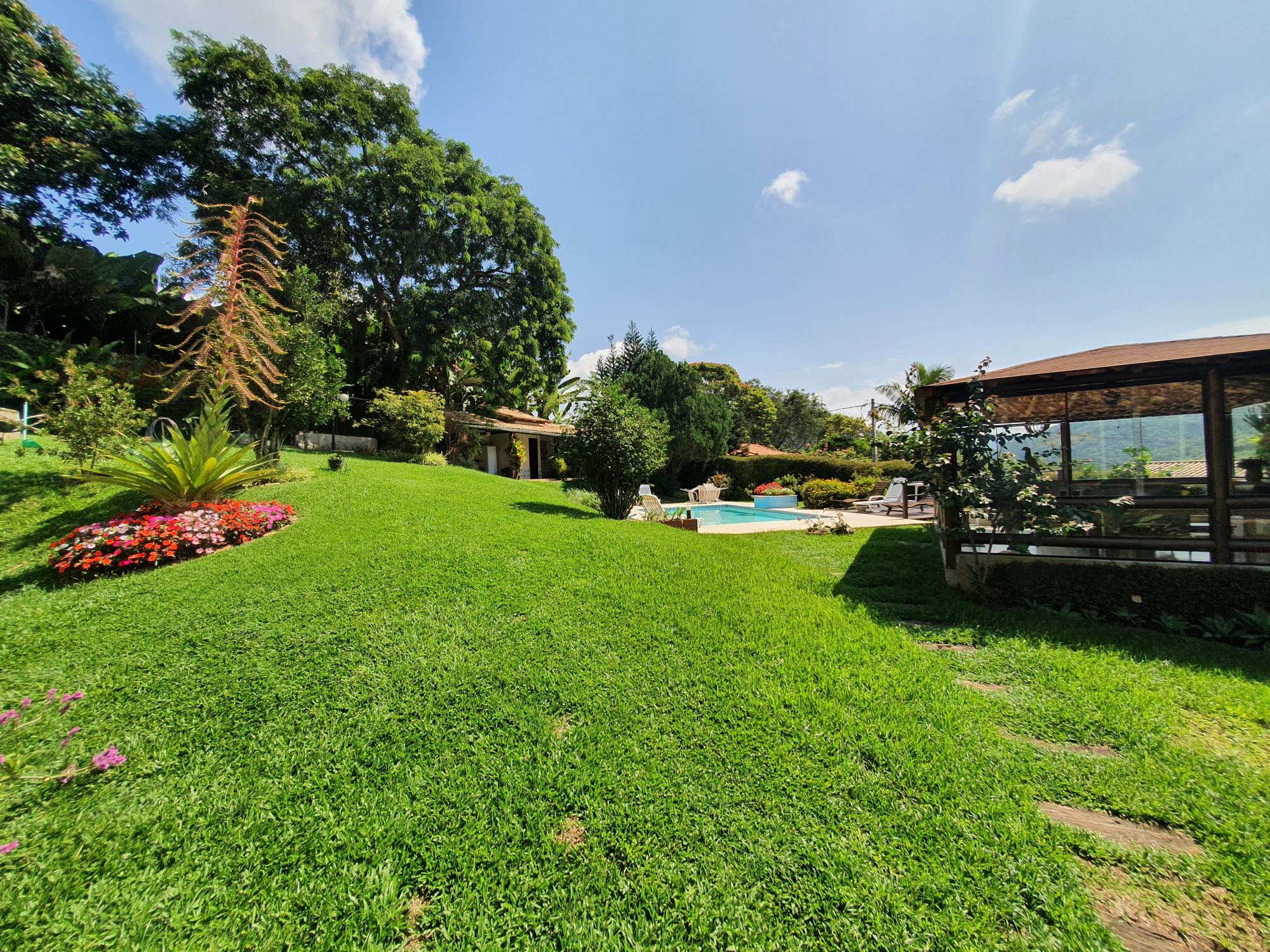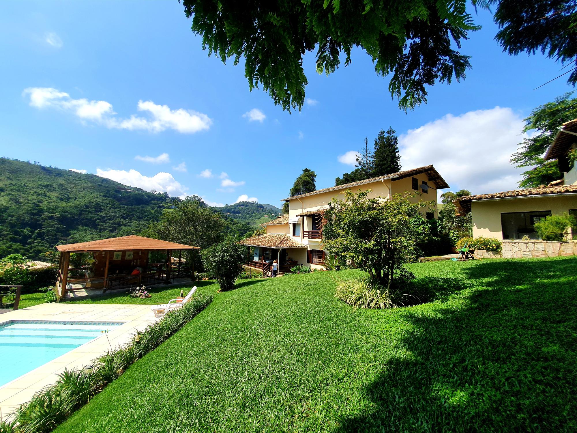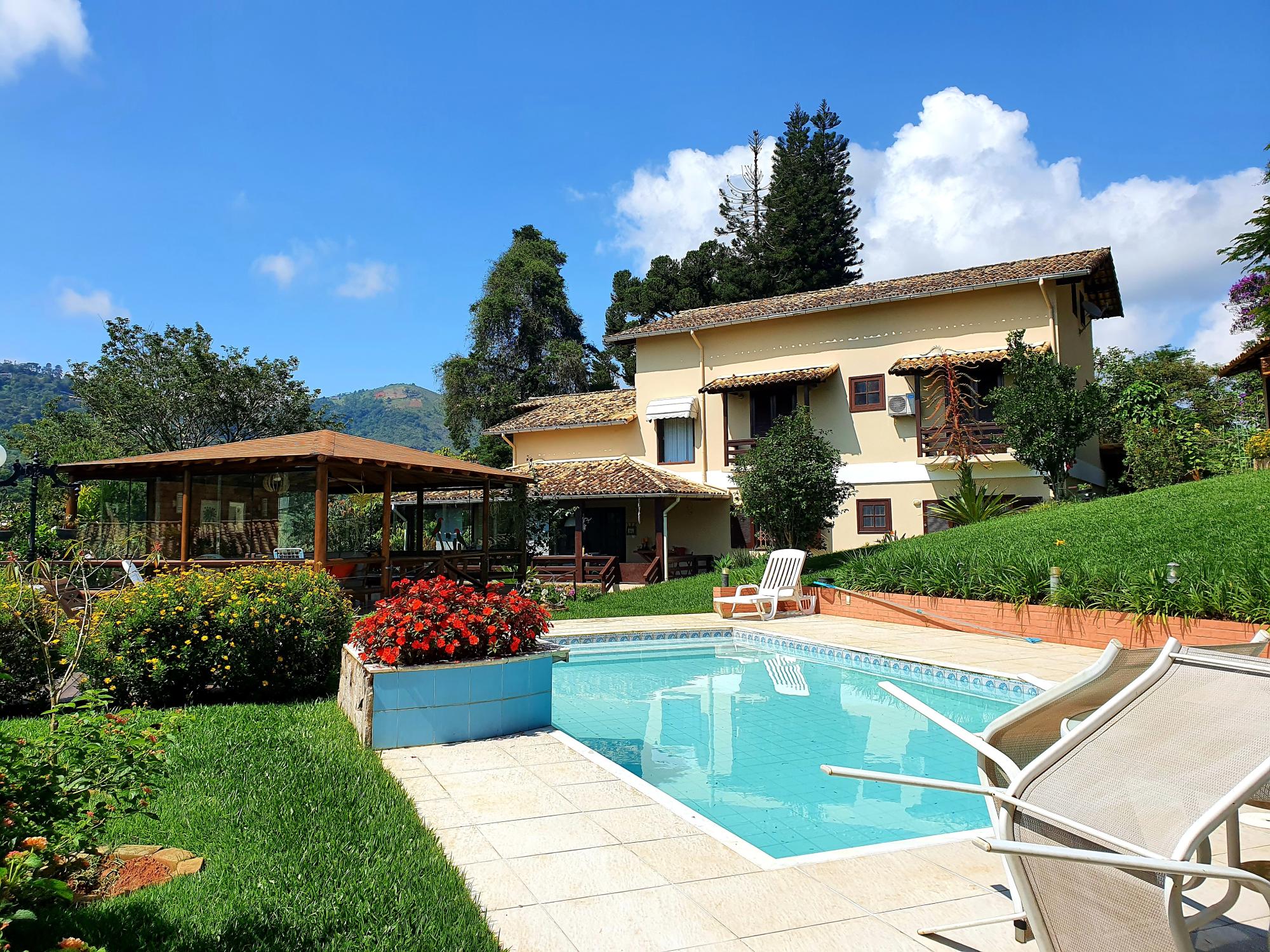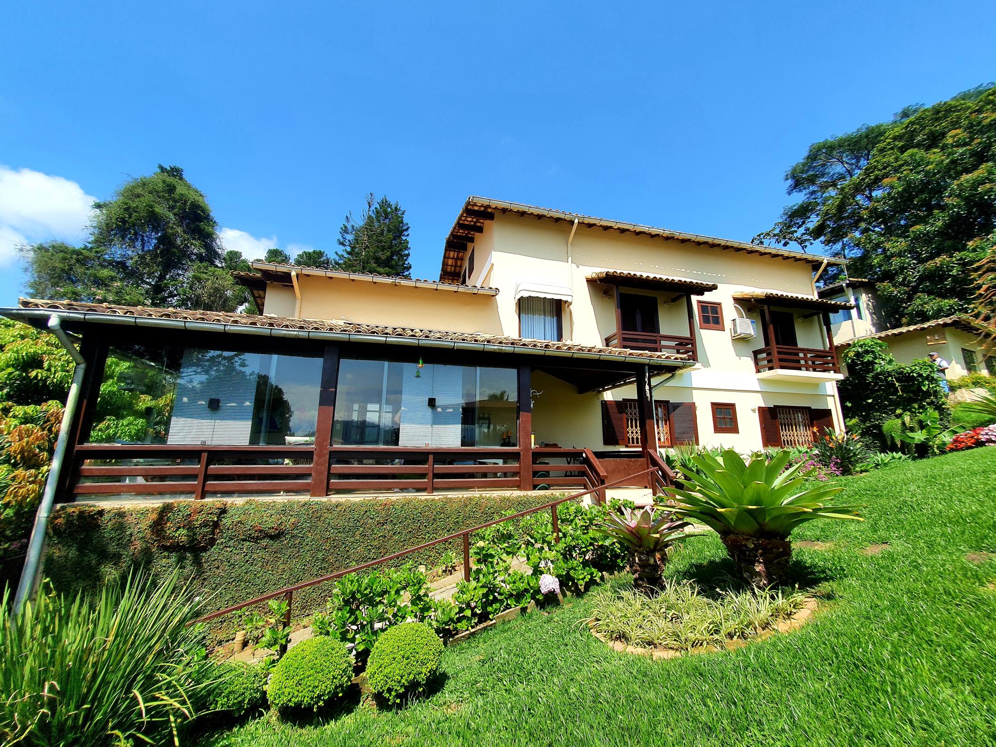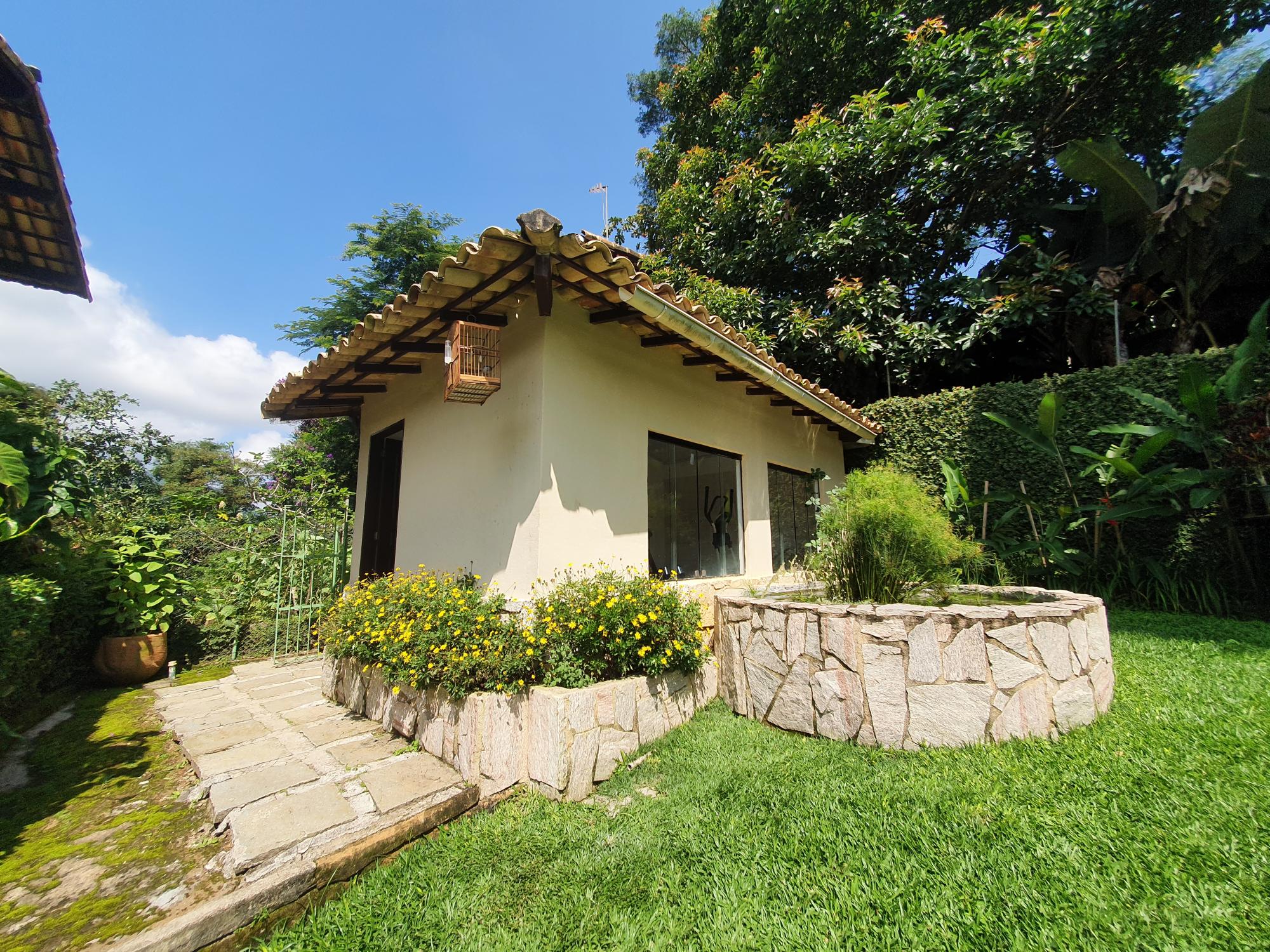Ótima casa em condomínio de fácil acesso. Terreno com lindo jardim sendo aproximados 1.300m² de boa topografia. A casa com área construída de 600m2 é muito bem distribuída com cômodos bem espaçosos, sendo uma varanda fechada com blindex, sala em 03 ambientes (estar, jantar e tv), lavabo, espaçoso escritório com banheiro, 4 ótimos quartos sendo 02 suítes, ampla cozinha com armários, área de serviço, garagem para 02 carros. Na parte externa uma área de lazer com piscina e churrasqueira coberta, academia, pequeno lago e casa de caseiros com 02 quartos.